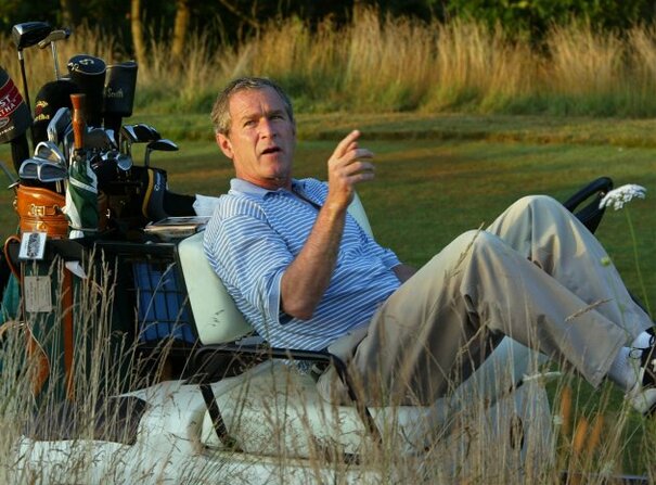 Photo: (AP Photo/J. Scott Applewhite, File) Former US President George W. Bush stretches out in his golf cart at the Cape Arundel Golf Club in Kennebunkport, Maine.