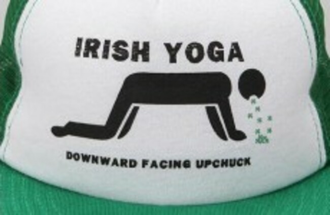 The range includes a t-shirt reading “Kiss me. I’m drunk or Irish, or whatever” and an “Irish yoga” baseball cap with a person being sick.