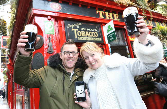 Jenna and Mark Durrant from England raising a pint outside the Temple Bar pub. Sam Boal