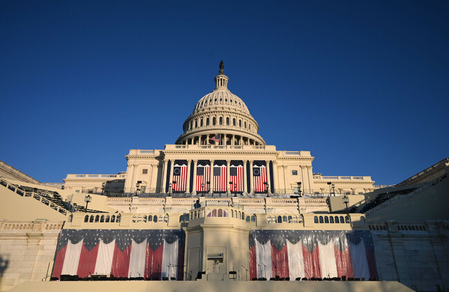 Preparations stopped at Inaugural Platform after announcement ceremony will be moved inside due to extreme cold weather Alamy Stock Photo