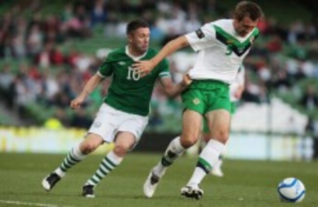 Republic of Ireland's Robbie Keane and Gareth McAuley of Northern Ireland, Carling Nations Cup, 24 May 2011 ©INPHO/Cathal Noonan