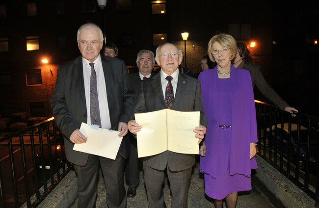President-elect Micheal D Higgins is presented with the formal notification of his election as president outside his Dublin home in 2011. Sasko Lazarov/RollingNews.ie