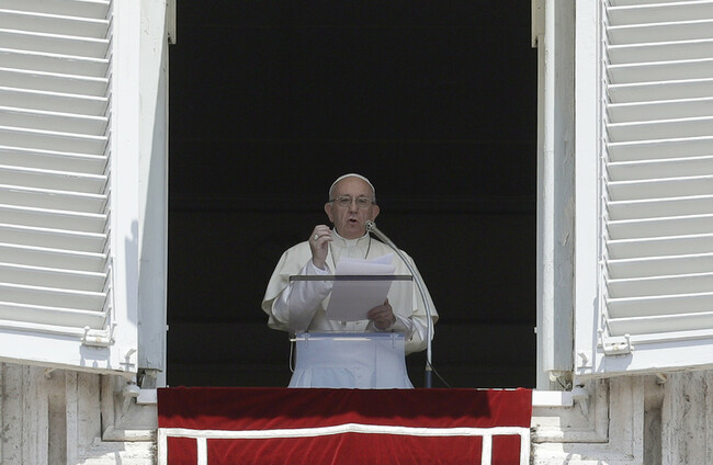 Pope Francis delivers his message during the Angelus noon prayer in St Peter's Square at the Vatican. AP/PA Images