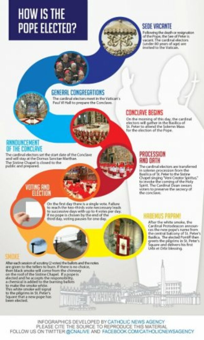 The support of two-thirds of the 115 ‘cardinal electors’ is needed for the successful candidate. Who that will be is a guessing game right now but this handy infographic from the Catholic News Agency shows you how it all works: