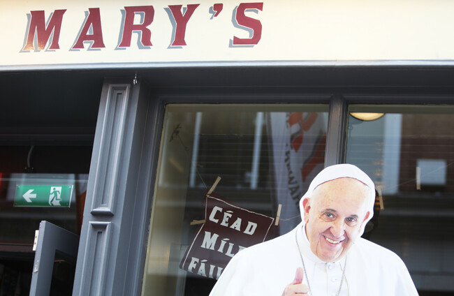 A Pope Francis cardboard cutout on Wicklow St in Dublin. Leah Farrell/RollingNews.ie