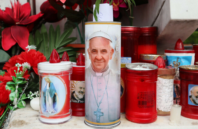 Candles bearing the image of Pope Francis outside Rome's Gemelli hospital. Alamy Stock Photo
