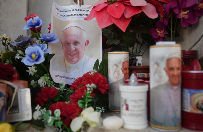 Candles and a photo of Pope Francis outside Rome's Gemelli hospital. Alamy Stock Photo