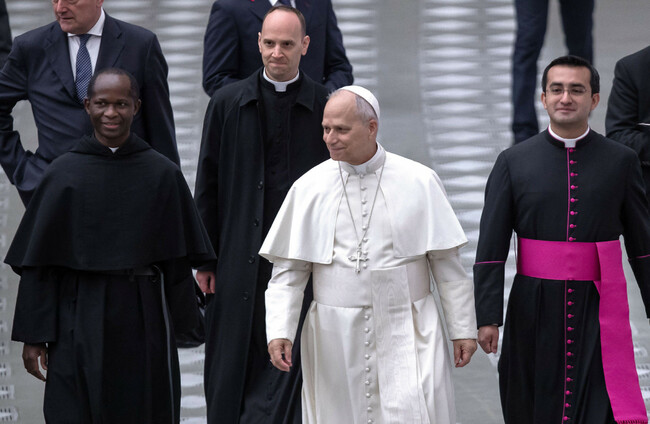 Pope Leo XIV, flanked by Father Edward Daniang Daleng, vice-regent of the papal household, don Marco Billeri, second personal secretary of Vatican City, Vatican. Alamy Stock Photo