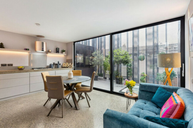 Inside, the finish is as refined as it is striking. Terrazzo flooring paired with underfloor heating, slatted timber panelling and seamless bespoke joinery create an atmosphere of quiet sophistication. The kitchen and dining space forms the heart of the home, featuring high-gloss cabinetry, polished concrete worktops and direct terrace access making for an ideal setting for both everyday living and entertaining.