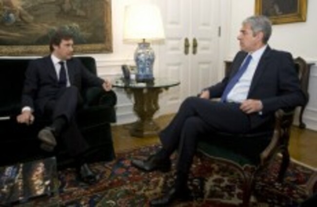 Portuguese Prime Minister Jose Socrates, right, talks with the opposition Social Democrat leader Pedro Passos Coelho at Sao Bento palace in Lisbon.