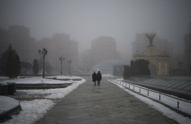 A couple walks through an empty Independence Square during an air raid alarm in Kyiv. Felipe Dana/PA