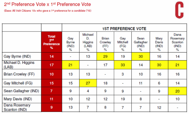 Byrne’s support was strongest among women and younger voters, but enjoyed broad appeal in all regions but Connacht/Ulster. Higgins enjoys support among middle-aged and older voters, as well as strong support from male voters, but surprisingly enjoys better support in Dublin than in his own Connacht/Ulster region.