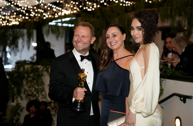 Richard Baneham, left, winner of the award for best visual effects for "Avatar: The Way of Water", Ashling Baneham, and Bailey Bass attend the Governors Ball after the Oscars. Alamy Stock Photo