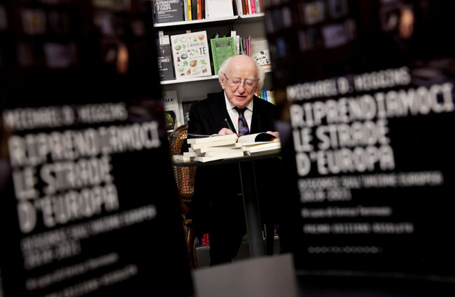 President Michael D Higgins at Spazio Sette Libreria bookshop in Rome yesterday.