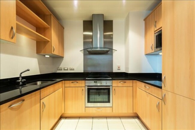 There is a kitchen, living room with balcony, family bathroom and three bedrooms in the apartment. One of the bedrooms is en-suite. There are high ceilings throughout, gas-fired central heating and underground parking. There is also 24-hour security for the complex.