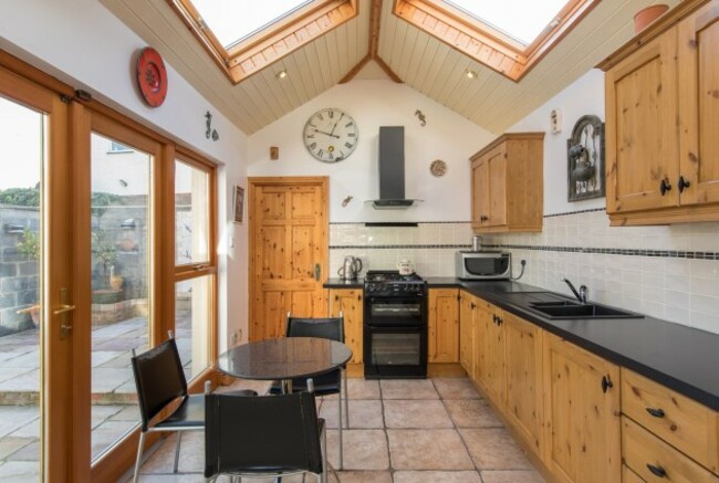 The house has spacious accommodation with an open plan kitchen/dining with  cream cabinets, a vaulted ceiling with sky lights and a breakfast counter. The living room has a bay window with floor to ceiling glazing and there is a guest utility also. There are six bedrooms of which two are en-suite.
