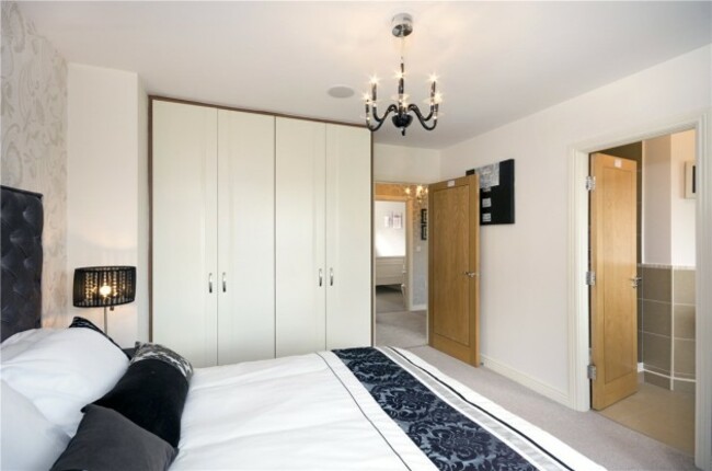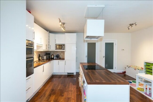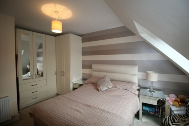 The house comprises a lounge with semi-solid walnut flooring and a log-effect gas fire, an open plan kitchen/living room/dining room with high-gloss kitchen units, a glass gable wall and integrated appliances. Upstairs there are four bedrooms over two floors, with the master bedroom en suite. The attic has been converted, floored and shelved.