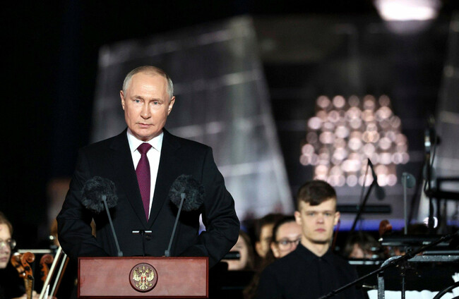 Putin delivering remarks during a gala event celebrating the 80th anniversary of victory in the Battle of Kursk during World War Two yesterday. Alamy Stock Photo