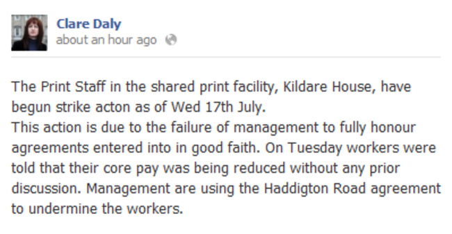 Deputy Clare Daly said on her Facebook page today that workers at the print facility in Kildare House have begun strike action as a result of a failure of management “to fully honour agreements entered into in good faith”.