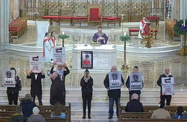 The protest happened after the distribution of the Eucharist and one of the banners read “silence is violence” and another read “don’t make Christ complicit in genocide”.