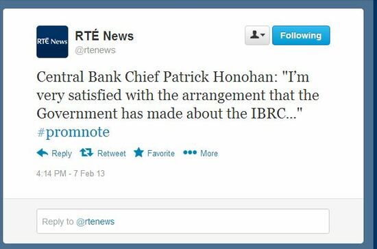 RTÉ is reporting that Central Bank head Patrick Honohan is happy with this afternoon’s events: