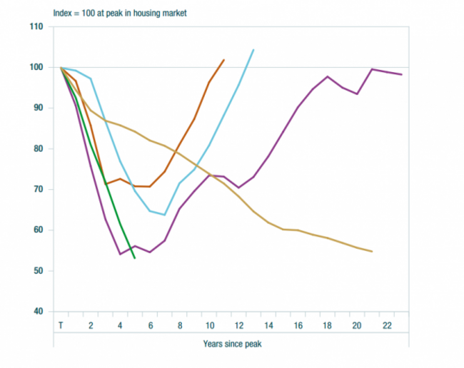 Ireland’s property decline, illustrated in green, is among the sharpest in modern history. Image: Central Bank of Ireland.