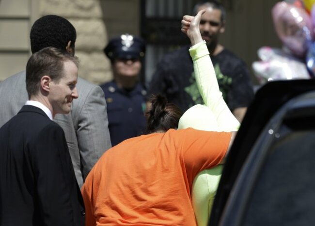 Gina DeJesus, one of three women held captive for about a decade at a run-down Cleveland house, gives a thumbs-up as she is escorted toward her home Wednesday, May 8, 2013, in Cleveland.
