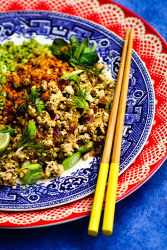 5. To serve, split the vibrant green ‘rice’ between two plates, matched with the same amount of laab. Top the laab with extra spring onion, crushed peanuts, sprigs of fresh mint and dill and a thick wedge of lime each. This is fairly mild, so by all means add thinly sliced fresh chilli on top and, of course, eat with chopsticks for the full effect!