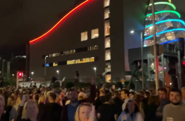 The demonstration outside the Convention Centre started at around 8pm with crowds remaining in the area past midnight. Many in attendance carried Irish flags and the crowd chanted “shame on you” and “no Covid pass”.
