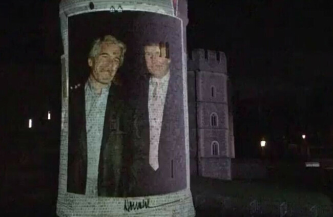 PROTESTERS LAST NIGHT projected images of Donald Trump and sex offender Jeffrey Epstein onto Windsor Castle, where the US president will be treated to a lavish banquet today.