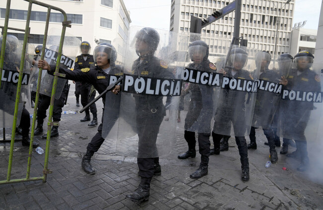 Police in riot gear hold their ground at a barricade during clashes with anti-government protesters in Lima, Peru. AP/PA Images
