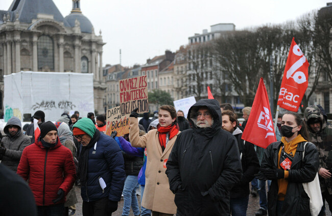 Protesters in Lille showing opposition to Daramanin's bill on International Migrants Day, 18 December 2022. Alamy Stock Photo