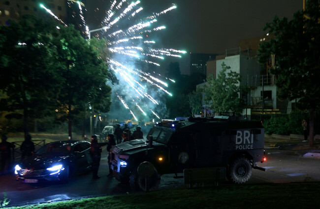 paris-france-29062023-19th-district-rioting-in-a-housing-estate-in-the-19th-arrondissement-following-the-death-of-nahel-in-nanterre-confrontation-with-police-on-avenue-de-flandre-with-firewor Fireworks being used against police at a protest in a Parisian suburb last month. Alamy Stock Photo Alamy Stock Photo