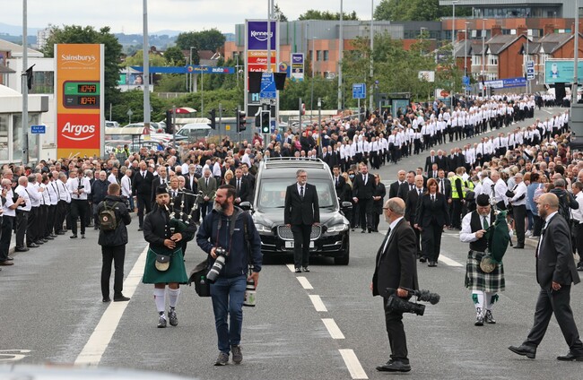Sinn Féin leader Mary Lou McDonald, Stormont’s deputy first minister Michelle O’Neill and other prominent Sinn Féin politicians attended the funeral of Storey on 30 June.