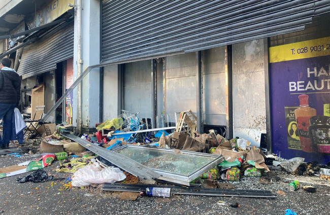 Sham Supermarket on Donegall Road in Belfast. The shop was burned during disorder in the area, following an anti-immigration protest on Saturday. Alamy Stock Photo