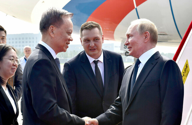 Putin touched down in Tianjin with an entourage of senior politicians and business representatives.