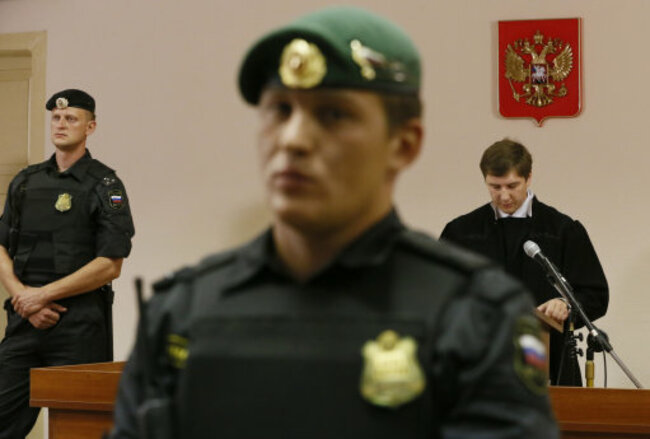 (Bailiffs stand guard as judge Sergei Blinov, right, reads a verdict in a court in Kirov, Russia. Dmitry Lovetsky/AP/PA Images)