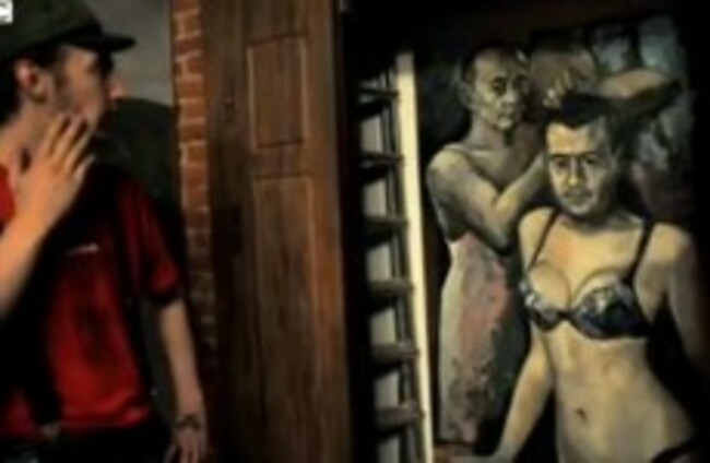 One of the paintings confiscated shows Putin playing with Medvedev’s hair. He is wearing a strappy nightie, while Medvedev has cleavage bursting out of a bra and is wearing skimpy knickers.