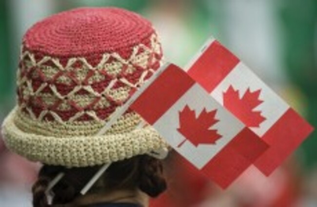 A woman wears miniature Canadian flags as she celebrates Canada Day. Graham Hughes
