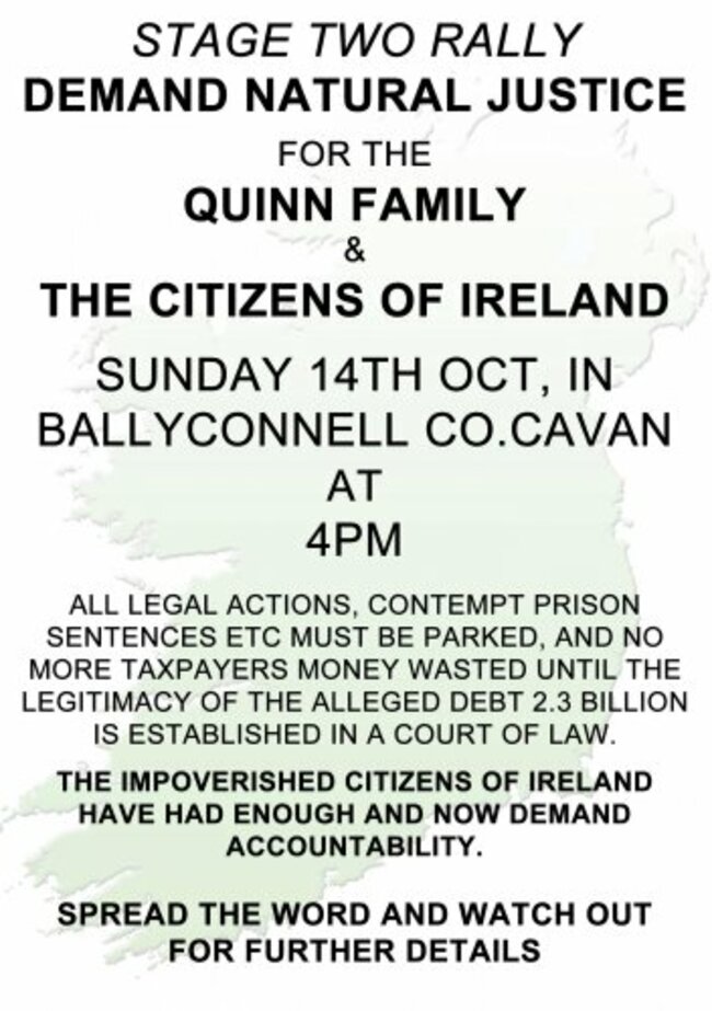 A group called Concerned Irish Citizens is organising the event, which is demanding “natural justice for the Quinn family and the citizens of Ireland”.