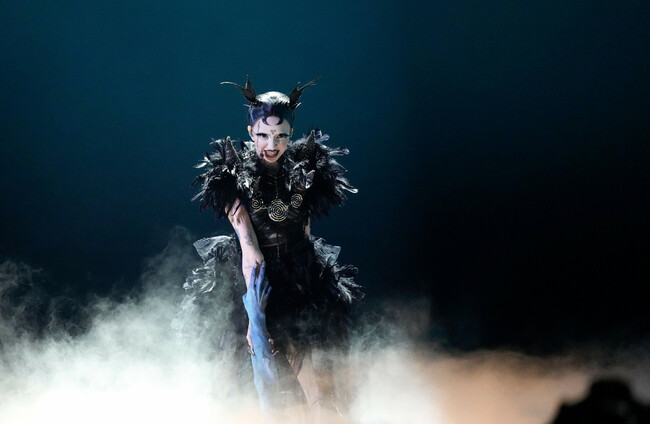 Bambie Thug performs Doomsday Blue during the dress rehearsal for the first semifinal at the Eurovision Song Contest in Malmo, Sweden. Alamy Stock Photo