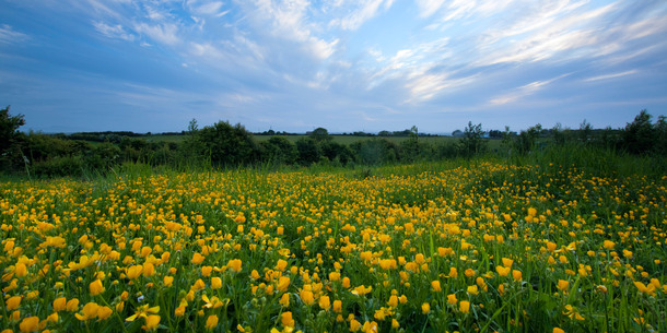 Which flower, known for its bright yellow blooms, is commonly found in Irish meadows in June?