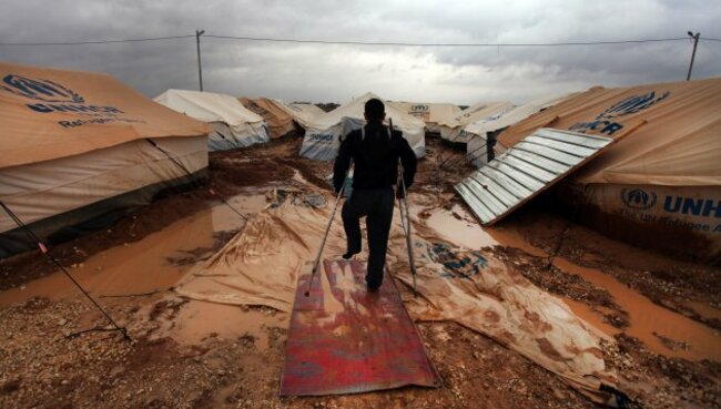 A Wounded Syrian refugee man makes his way on water and mud, at Zaatari Syrian refugee camp, near the Syrian border in Mafraq, Jordan. (Image: Mohammad Hannon/AP)