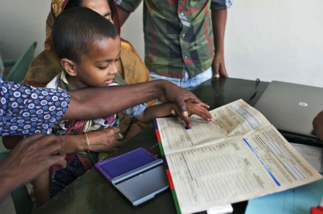 A Bangladeshi child affixes her thumb impression on a bank document as relatives and victims gather to list their names for compensation in Savar, Dhaka.