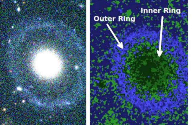 New research gives the first description of a well-defined elliptical-like core surrounded by two circular rings – a galaxy that appears to belong to a class of rarely observed, Hoag-type galaxies.