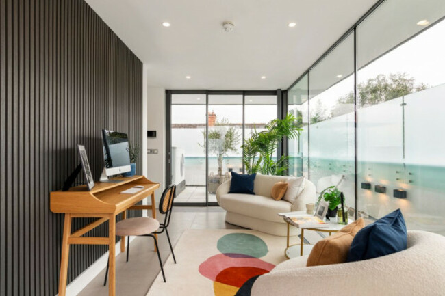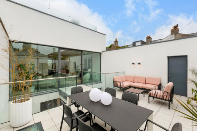 The uppermost floor adds another layer of flexibility with a glass-wrapped sun room that would work equally as well as a second lounge, creative studio or home office. From here, a wraparound terrace reveals rooftop views across the neighbourhood, including a direct sightline to Rathmines’ iconic clock tower for a subtle reminder of the home’s central yet sheltered location.