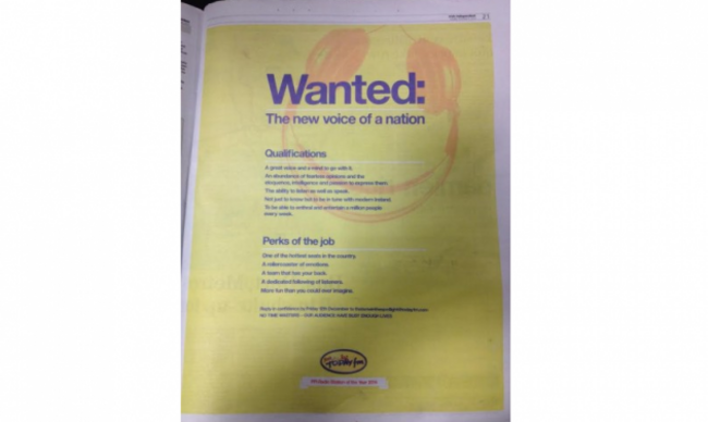 The ad appeared in the Irish Independent and The Irish Times in the wake of the Kildare broadcaster’s departure from the station earlier this month.
