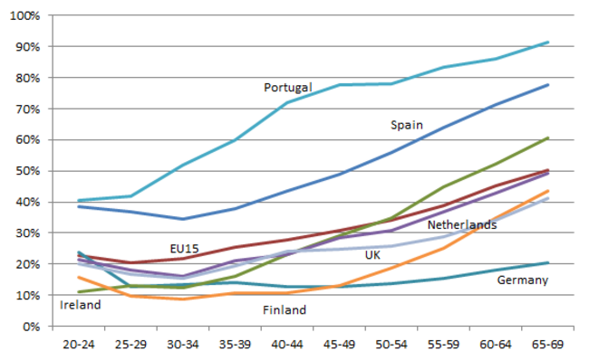 Percentage of the population with no more than lower secondary education, by age cohort, 2010.