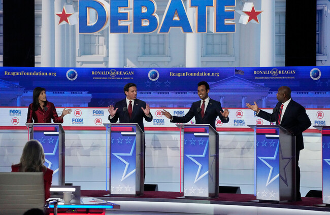 From left to right, former U.N. Ambassador Nikki Haley, Florida Gov. Ron DeSantis, businessman Vivek Ramaswamy and Sen. Tim Scott, R-S.C., argue a point during a Republican presidential primary debate hosted by FOX Business Network Alamy Stock Photo