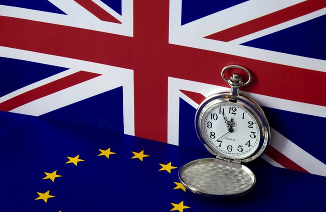 A pocket watch next to the British and EU flags. Photo: S. Steinach. - NO WIRE SERVICE - | usage worldwide DPA/PA Images